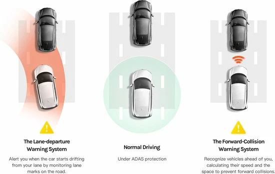 -Er zit ADAS technologie op waardoor hij gevaarlijke situaties kan herkennen en je waarschuwd met geluid wanneer er een gevaarlijke situatie plaatsvindt.