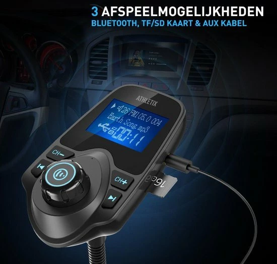 Met deze 5 in 1 Carkit wordt handsfree bellen gemakkelijk. Met de FM-transmitter van Athletix kan je muziek streamen via Bluetooth in de auto en ook nog eens handsfree bellen. Plug de 5 in 1 Draadloze Carkit in je 12 of 24V aansluiting, koppel het via Bluetooth (eenmalig) met je mobiele telefoon en stel vervolgens de zendfrequentie om geluid af te spelen over de luidsprekers in de auto.