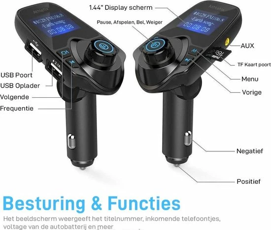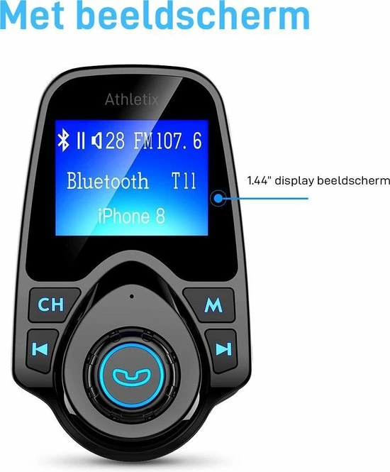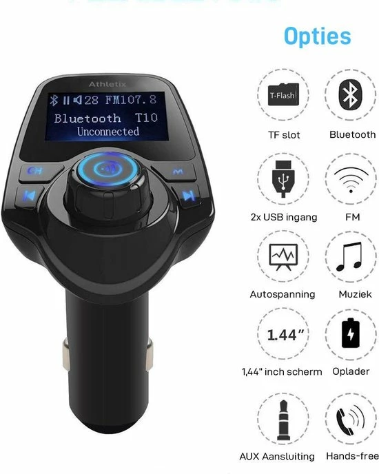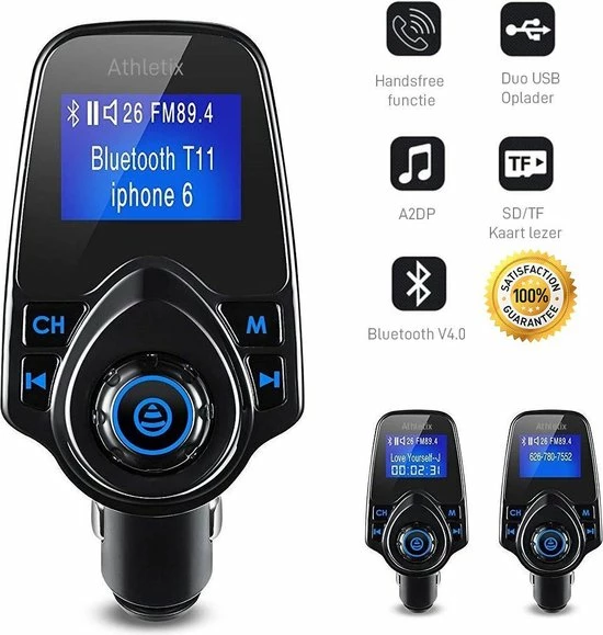 Met de FM-transmitter van Athletix kan je gemakkelijk muziek streamen vanaf je mobiel via Bluetooth in de auto en ook nog eens handsfree bellen.
