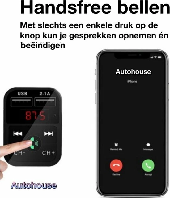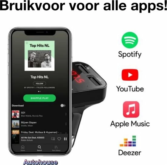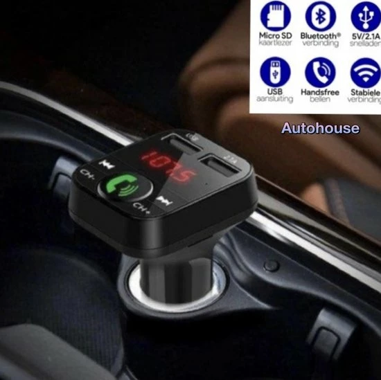 Met deze FM Transmitter kunt u via Bluetooth muziek luisteren in de auto. De transmitter ontvangt uw audio via Bluetooth en zet dit signaal vervolgens om in een FM-signaal, wat opgevangen kan worden door de autoradio. Het geluid komt uit de boxen van uw auto!