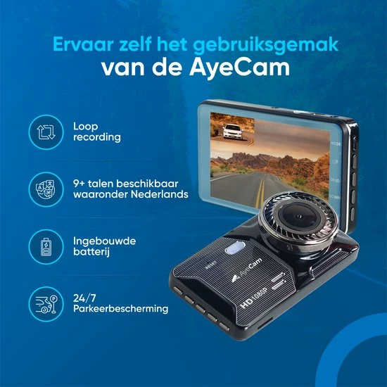 - Zeer gebruikersvriendelijk ? De AyeCam Dashcam schakelt automatisch uit en aan. Hierdoor heb jij geen omkijken naar je camera en neemt hij direct alles op.