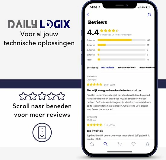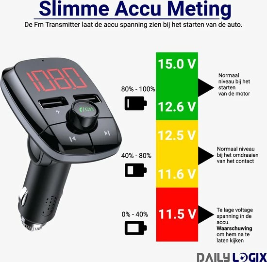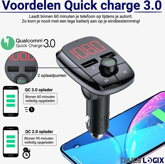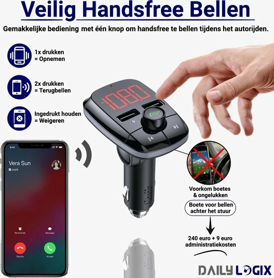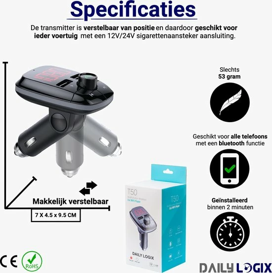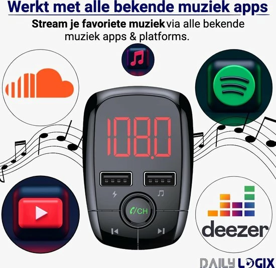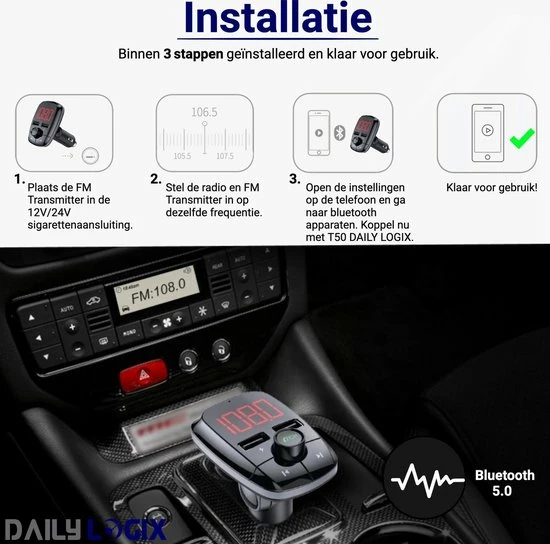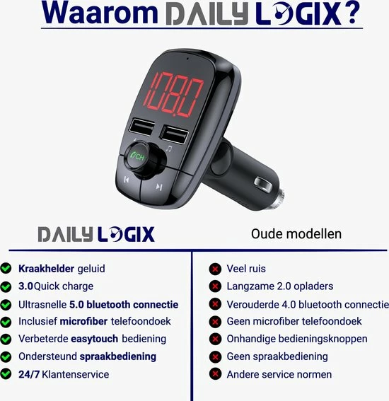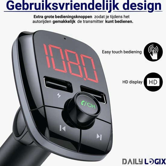 De multifunctionele FM Transmitter van DAILY LOGIX is geschikt voor elke auto, en te gebruiken voor alle telefoons met een bluetooth functie. E?n ding is zeker, je autorit wordt een stuk comfortabeler!