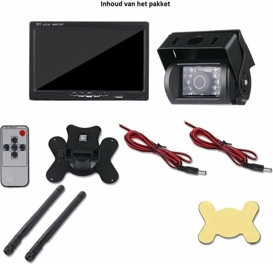 De camera wordt standaard geleverd met een video verlengkabel met tulp aansluiting om aan het display in de auto aan te sluiten, en een DC adapter kabeltje. De camera en het display werken beide op 12V DC.