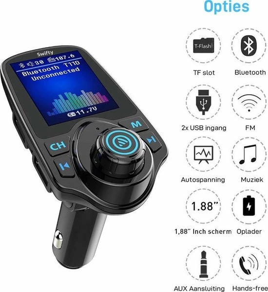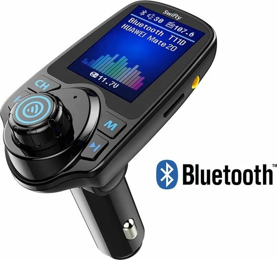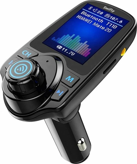 Met de FM-transmitter van Swifty kan je muziek streamen, Handsfree bellen, muziek streamen en navigeren en dat allemaal draadloos via de carkit. Plug de draadloze Carkit in je 12v of 24V aansluiting, koppel het via Bluetooth (eenmalig) met je mobiele telefoon en stel vervolgens de zendfrequentie om geluid af te spelen over de luidsprekers in de auto. Eenmaal verbonden kun je kraakhelder naar jouw muziek luisteren of bellen. Dit is de oplossing om veilig je auto te besturen!