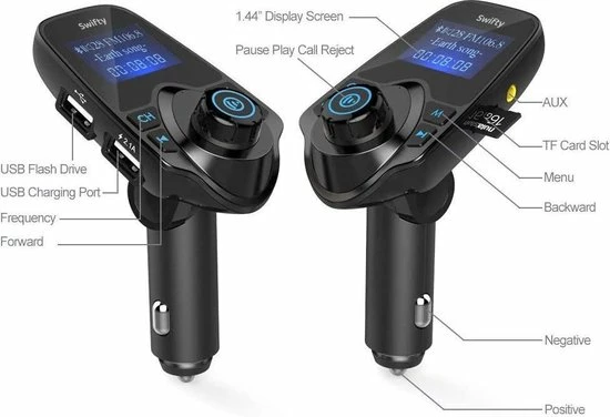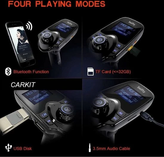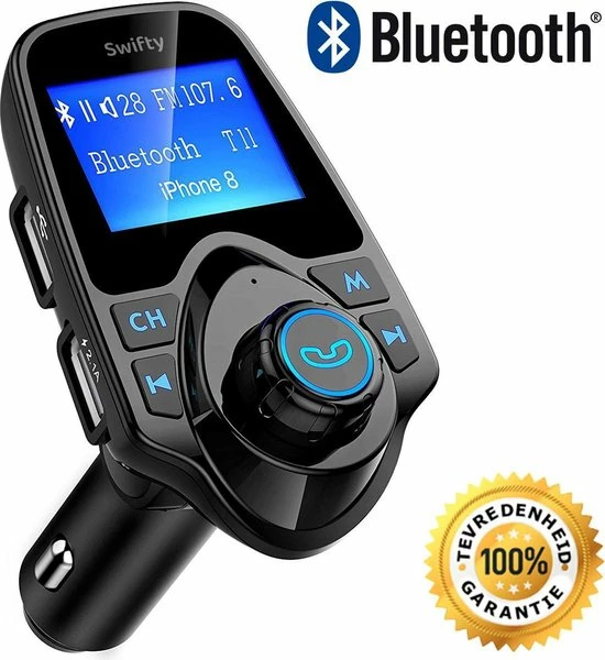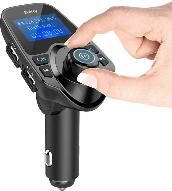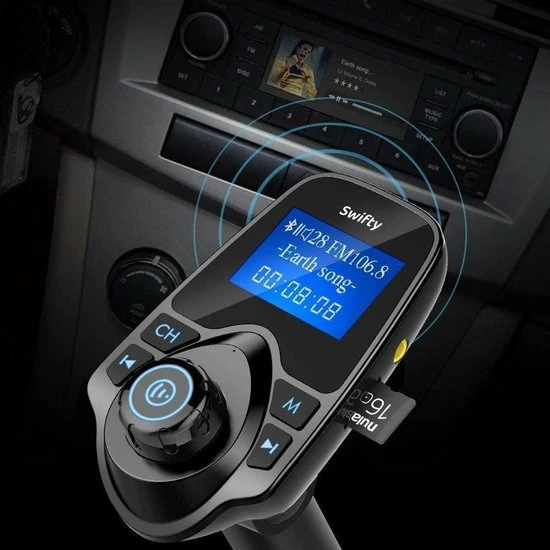 Met de FM-transmitter van Swifty kan je muziek streamen, Handsfree bellen, muziek streamen en navigeren en dat allemaal draadloos via de carkit. Plug de draadloze Carkit in je 12v of 24V aansluiting, koppel het via Bluetooth (eenmalig) met je mobiele telefoon en stel vervolgens de zendfrequentie om geluid af te spelen over de luidsprekers in de auto. Eenmaal verbonden kun je kraakhelder naar jouw muziek luisteren of bellen. Dit is de oplossing om veilig je auto te besturen!