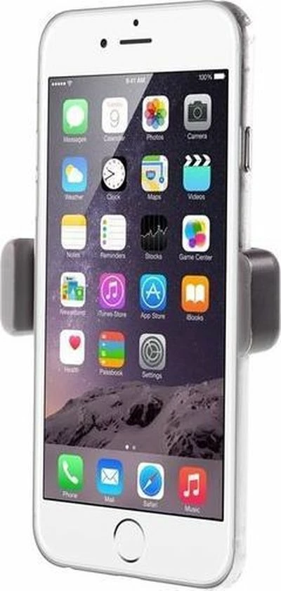 - Een veersysteem zorgt ervoor dat je telefoon goed geklemd zit in de houder.