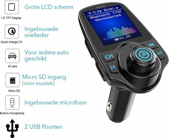 ? Geniet van hoge kwaliteit stereomuziek via de healtic T11d bluetooth-FM-Transmitter