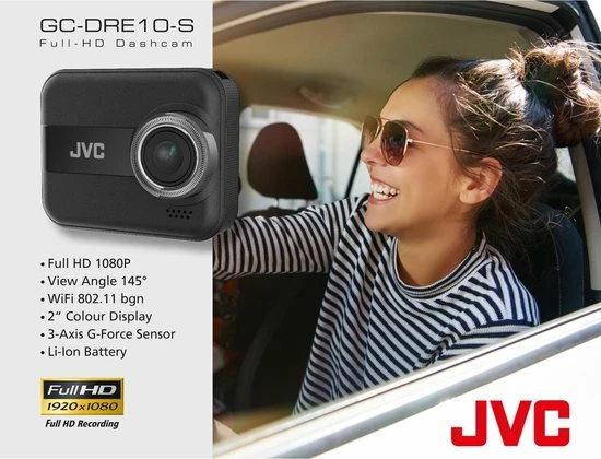 De compacte JVC GC-DRE10-E dashcam heeft een FULL HD-resolutie en een 145-graden groothoeklens. Daarmee leg je alles wat er op de weg gebeurt haarscherp vast op beeld en heb je helder bewijsmateriaal in handen als je betrokken raakt bij een ongeluk. Zelfs in donkere omstandigheden. De dashcam beschikt namelijk over een nachtzichtfunctie waardoor hij ook ’s avonds probleemloos heldere beelden schiet. Om er zeker van te zijn dat de dashcam ook daadwerkelijk filmt tijdens een ongeval, is hij voorzien van een G-sensor die plotselinge bewegingen signaleert waarna de dashcam vervolgens automatisch begint met filmen. Verder handig is de wifi-functie waar de dashcam mee uitgerust is. Hiermee verbind je de camera met een app op je smartphone en deel je de gemaakte beelden snel en eenvoudig.