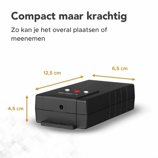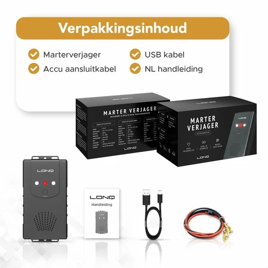 - Met meegeleverde voedingskabels– Bij de LONQ® marterverjager wordt zowel een gratis oplaadkabel als autoaansluiting geleverd. Je kan dus direct beginnen met het beveiligen van je auto of huis.