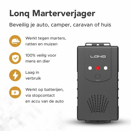 Deze marterverjager van LONQ® is zeer gemakkelijk in gebruik. Sluit het apparaat aan op de gewenste voeding met de meegeleverde kabels (USB, batterij of accu). Zet het apparaat vervolgens eenvoudig aan en je woning of auto is beveiligd tegen marters en ander ongedierte.