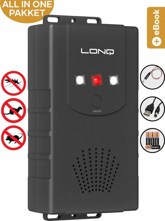 - Diervriendelijk en efficiënt– De verjager van LONQ® zendt geluid uit op hoge frequentie. Deze geluiden zijn niet schadelijk voor mensen of dieren maar verjagen knaagdieren, ongedierte en zelfs insecten. Dankzij de verstelbare frequentie wennen de dieren niet aan het geluid waardoor deze effectief blijft.