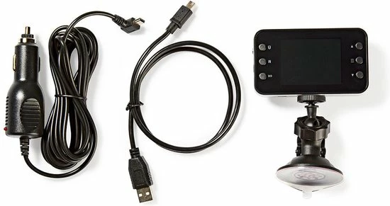 De dashcam wordt compleet geleverd met een houder met zuignap, een extra lange laadkabel voor in de auto van 3,4 m en een mini-USB-kabel.