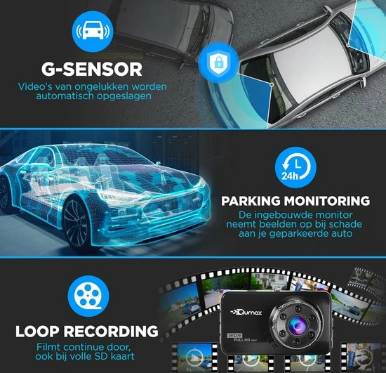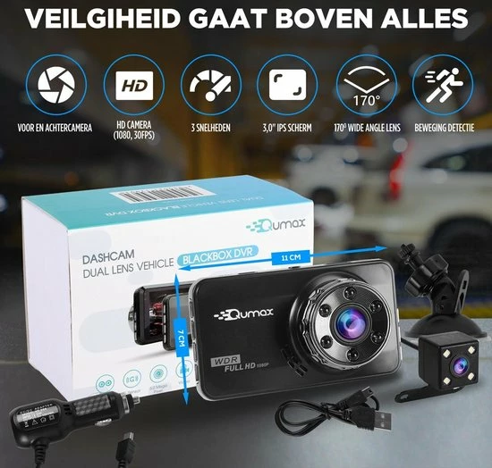 Met de dashcam van Qumax rijd je een stuk comfortabeler en kun je te allen tijde videobeelden van de verkeerssituatie opnemen. Bijvoorbeeld handig voor de verzekering wanneer er een ongeval of aanrijding heeft plaatsgevonden. De dashcam is uitgerust met een voor en achter camera en beschikt over handige functies zoals bewegingsdetectie, parkeerstand en G-sensor. Met een 170? wijdhoeklens en een hoogwaardig IPS-display is de Qumax dashcam een echte aanwinst.