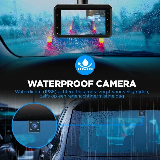 De dashcam kun je in een handomdraai op je voorruit monteren dankzij de krachtige zuignap. De achter camera is optioneel en dient op de achterruit of op de achterbumper van je auto bevestigd te worden. De achter camera is volledig waterdicht (IP68) en beide camera?s zijn uitgerust met nachtvisie. Zo maakt de dashcam zelfs tijdens een flinke regenbui of een donkere nacht scherpe beelden.