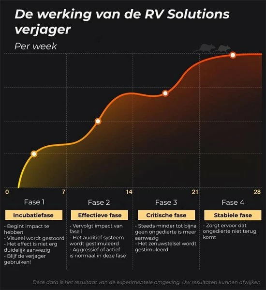 De marterverjager is veilig voor mens en dier. De marterverjager zendt namelijk ultrasone uit. Simpel gezegd: geluid op een hele hoge frequentie. Deze hoge frequentie is niet schadelijk. Marters en ander ongedierte kunnen deze hoge frequentie horen, maar het brengt geen schade aan. Omdat de marterverjager van RV Solutions elke 12 seconden een andere frequentie aanneemt, went het ongedierte niet aan de frequentie en blijft hij effectief.