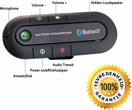Zoek jij een handige carkit die zorgt voor je veiligheid, snel gebruiksklaar is, makkelijk in gebruik is en enorm veel voordelen heeft? Dan is deze universele Bluetooth carkit d? oplossing. De carkit werkt in elke auto en met elke telefoon met Bluetooth. Je verbindt slechts ??n keer de carkit met je telefoon via Bluetooth en daarna maakt de telefoon automatisch contact met de carkit zodra je in de auto stapt. De carkit zelf klem je heel handig aan de zonneklep. Het apparaatje heeft een aan-/uittoets, toetsen voor opnemen en ophangen en volumeregeling. De ingebouwde speaker en microfoon zorgt voor een helder geluid zonder ruis. Het bedienen van je telefoon zelf is dus niet meer nodig (behalve wanneer je zelf een nummer moet kiezen). Daarnaast kun je met twee telefoons tegelijk verbinding maken. Opladen gaat eenvoudig via de bijgeleverde USB-kabel en adapter voor de sigarettenaansteker.