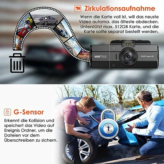 - ?Continue opname/G-sensor/Vantrue klantenservice?N2S dasch-Cam auto vervangt automatisch. het oudste bestand door het nieuwe voordat de kaart vol is. Belangrijke noodvideo wordt handmatig of automatisch. vergrendeld op “gebeurtenis” map. Wij adviseren Vantrue microSD-kaart, niet inbegrepen. Auto Camera heeft een garantie van 12 maanden, alle e-mails worden binnen 12 tot 24 uur beantwoord. Accessoires zoals autolader, USB C-kabel en houder zijn in het pakket inbegrepen, voldoen aan je dagelijkse behoeften.