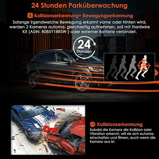 - 24 uur. Dual lens parkeerbewaking: de dubbele autocamera biedt creatieve 4 verschillende parkeermodi, bewegingsdetectie, botsdetectie, combinatie van bewegingsmelder en botsingsdetectie, en lagere bitsnelheidmodus, kan flexibel aan je bewakingsbehoeften in verschillende situaties voldoen. Met behulp van de hardwire kit kun je 24/7 bewaking (alle tijden) bereiken en de onderspanningsbeveiliging van de autoaccu, perfect en ideaal voor autobezitters en professionals in de taxi-, boven- en lyftgebied.