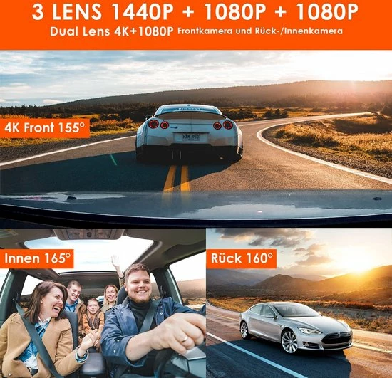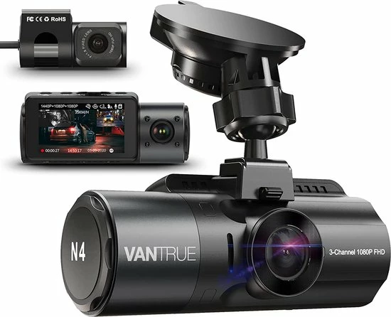 - ?3-Way 1440P+1080P+1080P/30FPS?VANTRUE N4 triple dashcam biedt een 155? frontcamera, 165? interieur en 160? achteruitrijcamera, om tegelijkertijd cabine, voor en achter op te nemen en u alle ronde bescherming te bieden wanneer u onderweg bent. Dubbele cameramodus legt kristalheldere helderheid van 2560x1440P / 30fps vast. De camera aan de voorkant kan naadloos alleen 1520P opnemen, duidelijke opname van kentekens en verkeersborden.