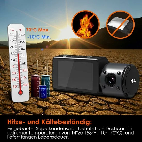 - ?Supercondensator en hittebestendig? Deze dashboardcamera wordt aangedreven door een supercondensator in plaats van een lithiumbatterij, ontworpen om extreme weersomstandigheden van -10 ? -70 ? C (14 ? F-158 ? F) te overleven, ideaal voor warme temperaturen of extreem koude gebieden. En het geeft ook een langere levensduur dan de dashcam met lithium-ionbatterij.