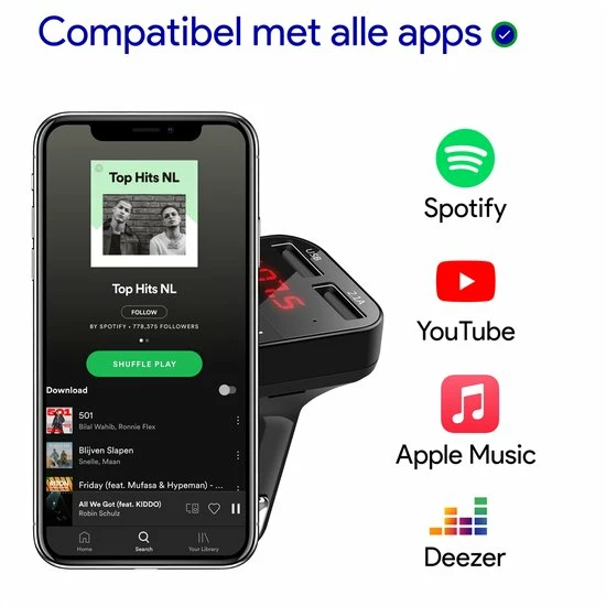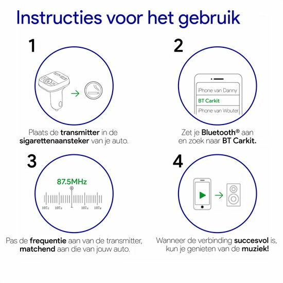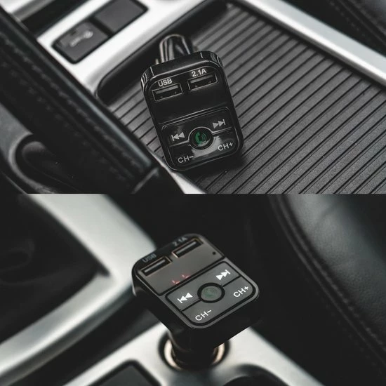 Met deze FM Transmitter kunt u via Bluetooth muziek luisteren in de auto. De transmitter ontvangt uw audio via Bluetooth en zet dit signaal vervolgens om in een FM-signaal, wat opgevangen kan worden door de autoradio. Het geluid komt uit de boxen van uw auto!
