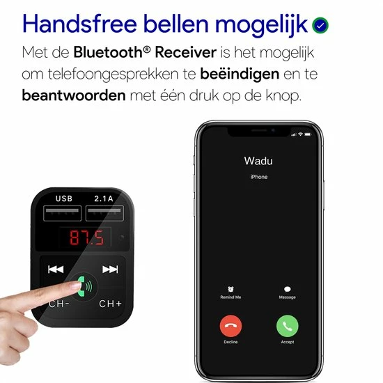 Het apparaat is voorzien van twee USB ingangen, hierop kunt u uw telefoon aansluiten en opladen. Dankzij de ingebouwde microfoon kunt u handsfree bellen.