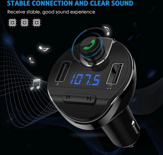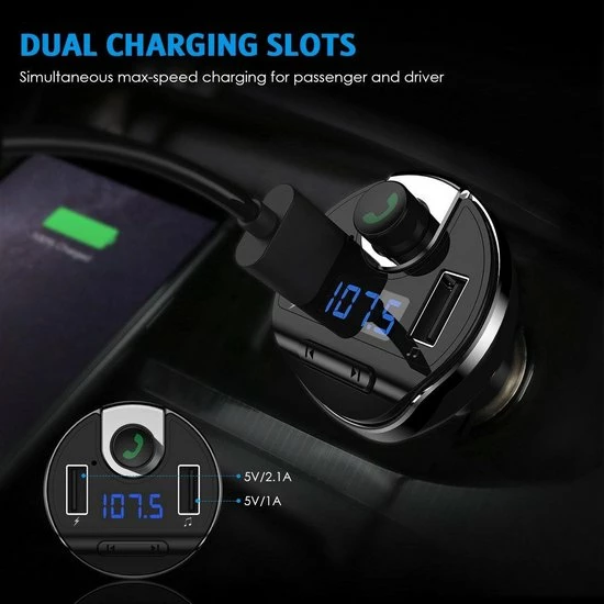ZT Accessoires Bluetooth Carkit Auto FM Transmitter Om Handsfree Te Bellen En Draadloos Muziek Te Streamen, Met Volumeknop En Oplaadfunctie Voor 2 Telefoons Tegelijkertijd | Display | Handsfree Bellen | USB Oplader | MP3 Speler Aux | TF-Kaart | Carkit T20